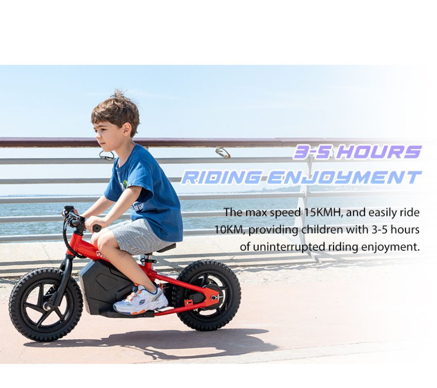 Designed for comfort, the EV06M features 12-inch inflatable tires and a 100W brushless motor, known for its low noise and minimal vibration. This allows the bike to ride smoothly in various terrains, including forests, snow, and cement surfaces, providing children with quieter and more stable riding experiences. Such comfort enhances their attention and enjoyment during rides.